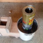Der Ofen ist nach dem Prinzip eines Rocketstoves gebaut. Über den anfänglich alleinig genutzten Blechbehälter hat er später einen Tontopf gestülpt (den Zwischenraum mit Lehm ausgefüllt), da diese Konstruktion die Wärme länger hält und eine angenehmere Strahlungswärme abgibt.