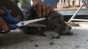 Er war völlig verfloht, seine Augen entzündet und zum Teil total von verfilztem Fell verdeckt und er hatte eine offene Wunde am Hinterteil.